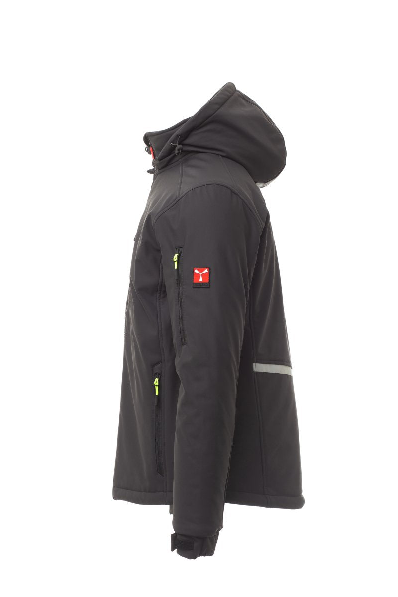 WP 8000 mm H2O, WVT 5000 g/m² 24u. Gevoerde soft-shell voor heren, SBS-ritssluiting met metalen treklipje "semi-auto lock” en gepersonaliseerde runner. Afneembare capuchon, verstelbaar met trekkoord. Binnenkraag met details aan de zijkant in fleece. Reflecterende strips op de achtergrond van de rug en de achterkant van de capuchon. Elastische manchetten, verstelbaar met klittenband. Twee zijzakken met rits, een borstzak met gecoate rits en een zak op de linkerarm met geïntegreerde penhouder, met ritssluiting. Fluorescerende runners. Een mesh binnenzak, met klittenbandsluiting. Onderkant verstelbaar met personaliseerbare stoppers.