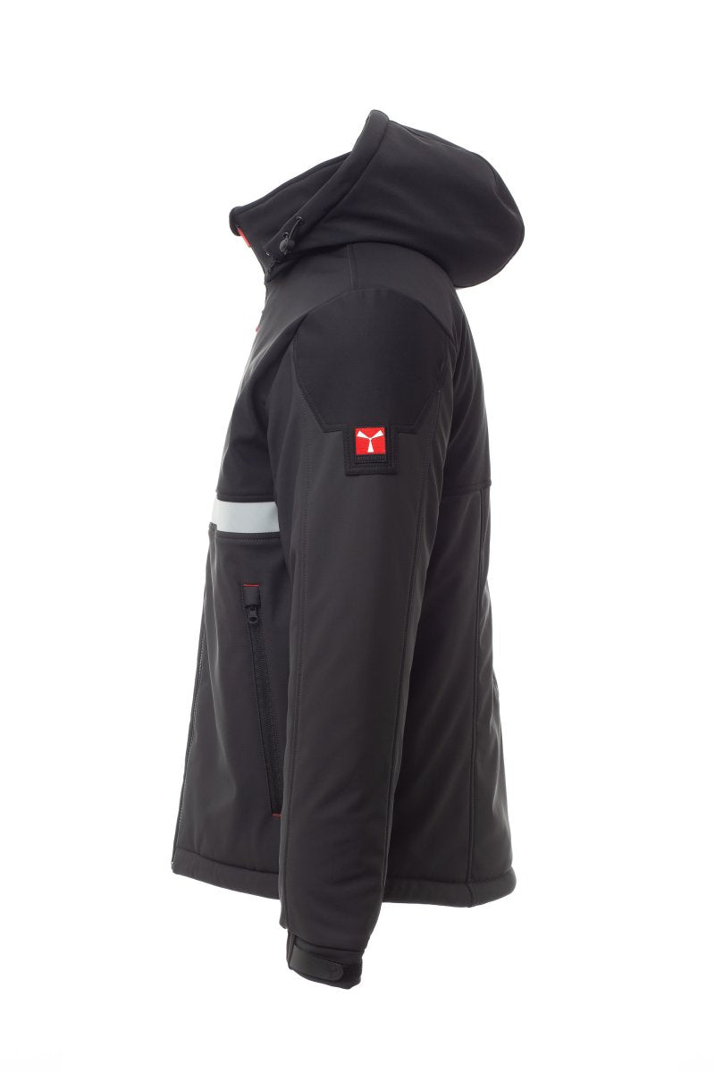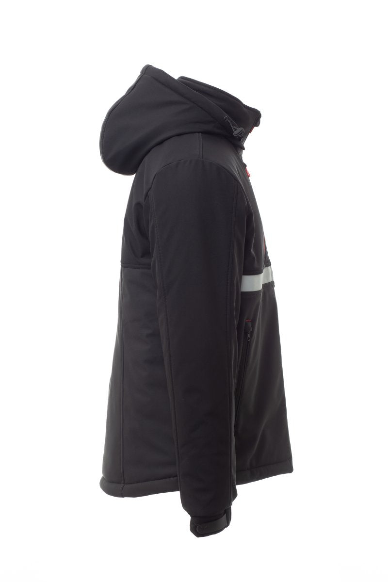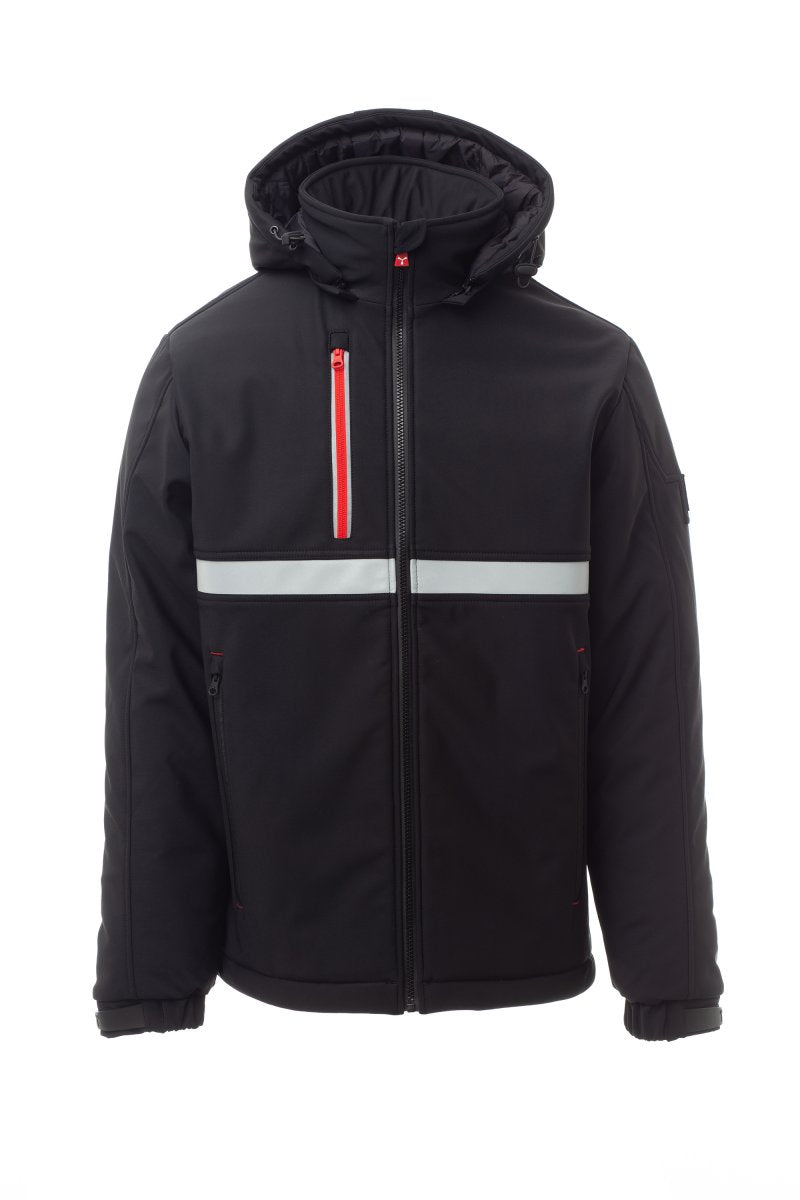 WP 8000 mm H2O, WVT 5000 g/m² 24u. Gevoerde soft-shell voor heren, SBS-ritssluiting met metalen treklipje "semi-autolock” en gepersonaliseerde runner. Afneembare capuchon, verstelbaar met trekkoord. Reflecterende strip vooraan op de borst. Elastische manchetten, verstelbaar met klittenband en polsband vanbinnen. Twee zijzakken met rits en een borstzak met ritssluiting met reflecterend detail. “Life-saving”-element op de rug, met reflecterend logotype vanbinnen, met ritssluiting. Twee binnenzakken: een met speciale vorm met rits rechts op de borst en een binnenzak om een tablet in te doen, met klittenbandsluiting. Onderkant verstelbaar met personaliseerbare stoppers.